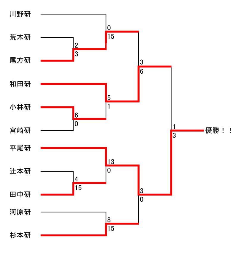 一方、試合には敗れたものの、杉本研はメンバー全員が試合そのものを楽しんでいる様子で、常に大声を出し合い笑顔でプレー。見ているこちらも楽しい気分になりました。  来年は、どの研究室が優勝を手にするのでしょうか。6連覇という大記録に挑む平尾研か? はたまた、平尾研の連覇を阻止する新たなチャンピオンが誕生するのか?! 来年の戦いからも目が離せません! みなさん、お疲れ様でした。