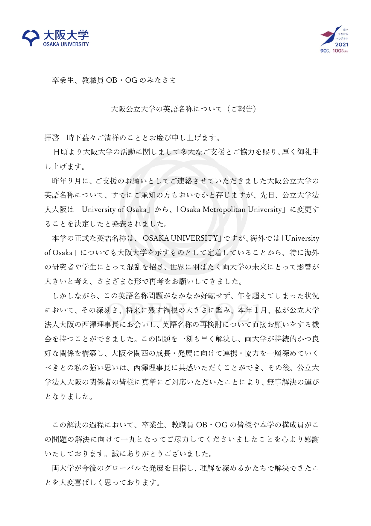 しかしながら、この英語名称問題がなかなか好転せず、年を超えてしまった状況 において、その深刻さ、将来に残す禍根の大きさに鑑み、本年1月、私が公立大学 法人大阪の⻄澤理事⻑にお会いし、英語名称の再検討について直接お願いをする機 会を持つことができました。この問題を一刻も早く解決し、両大学が持続的かつ良 好な関係を構築し、大阪や関⻄の成⻑・発展に向けて連携・協力を一層深めていく べきとの私の強い思いは、⻄澤理事⻑に共感いただくことができ、その後、公立大 学法人大阪の関係者の皆様に真摯にご対応いただいたことにより、無事解決の運び となりました。