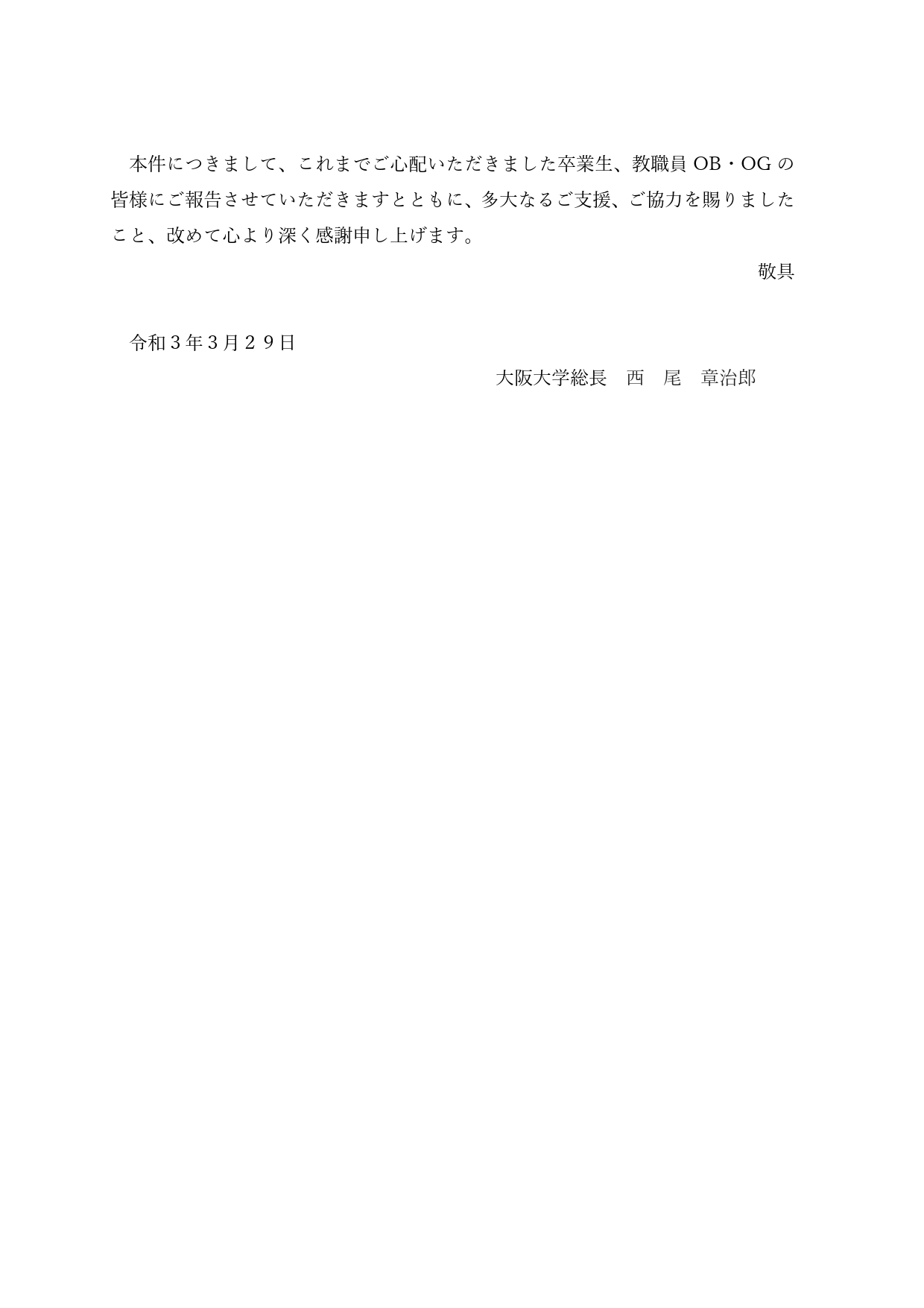 本件につきまして、これまでご心配いただきました卒業生、教職員OB・OG の 皆様にご報告させていただきますとともに、多大なるご支援、ご協力を賜りました こと、改めて心より深く感謝申し上げます。
