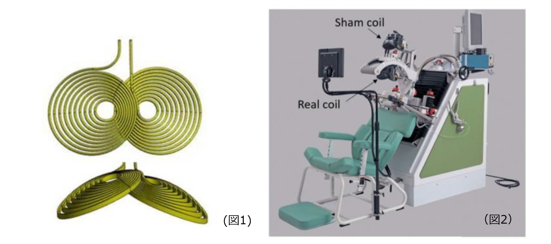 今回、研究グループは在宅用rTMS機器開発を目指し、帝人ファーマ(株)と共同開発し、臨床研究用に開発した未承認医療機器を用いて(図2 治験用機器)、日本人アルツハイマー型認知症に対する有効性を検討すべく探索的臨床試験を行いました。図1は我々が開発した偏心球面コイルを示しています。このコイルはエネルギー効率を改善させました。その結果、認知症のスクリーニング検査であるMMSE(ミニメンタルステート検査)が30点満点中15~25点の患者(軽度~中程度の認知症)であれば、偽刺激に対して有意な認知機能の改善を認めました。その効果は約20週継続しました。その治療効果は日本発のアルツハイマー型認知症薬であるドネペジルと比較しても劣るものではなく、むしろ即効性、持続性が示唆されました。うつ症状も改善される傾向がありました。