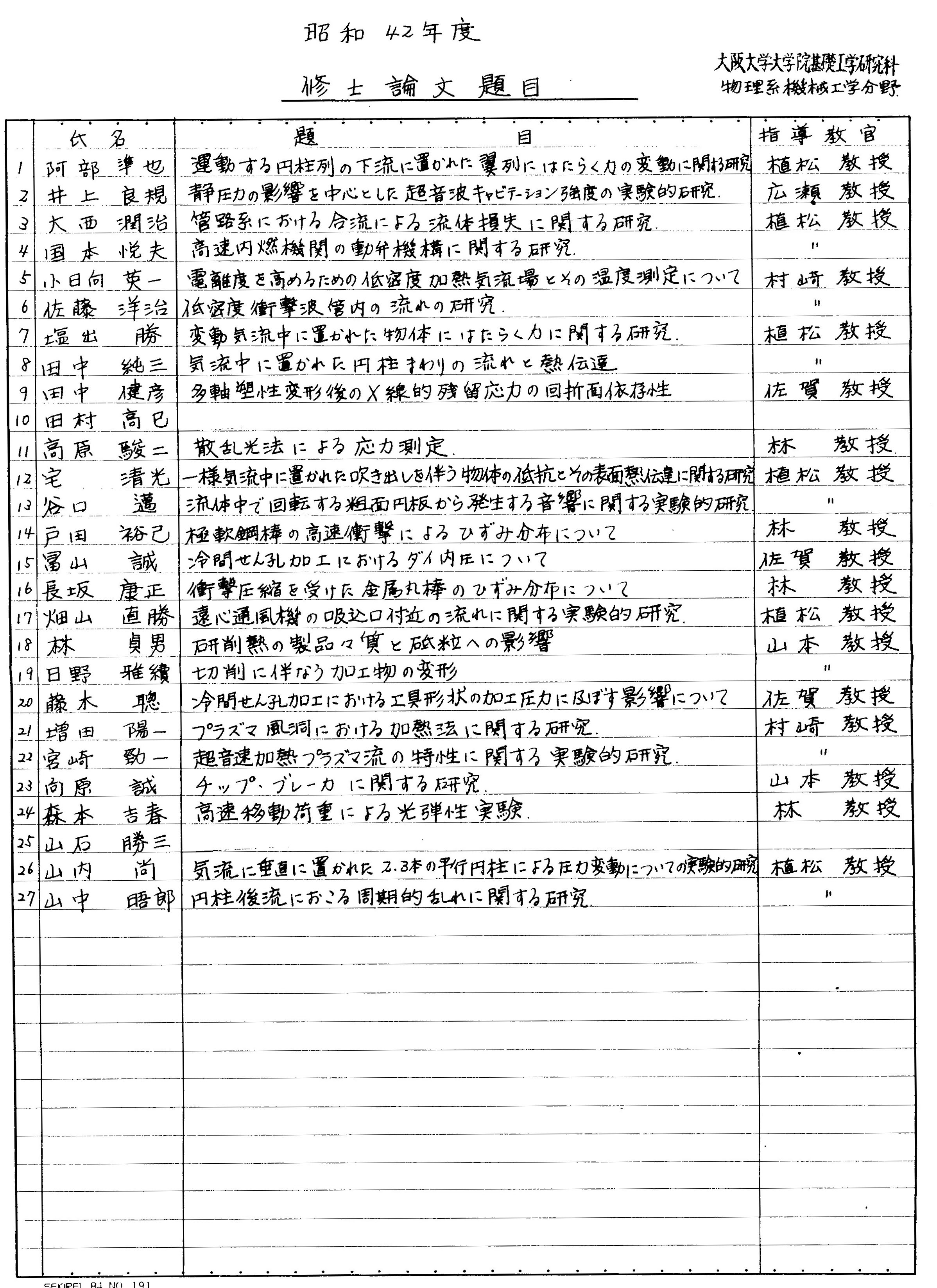 昭和42年度 修士論文題目